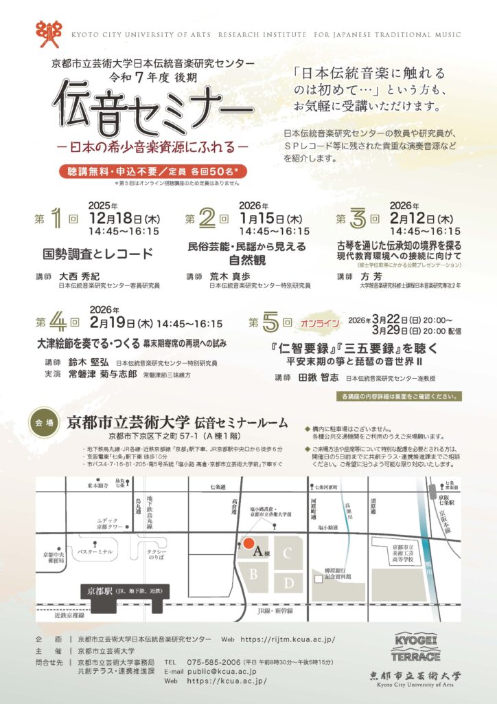 京都市立芸術大学日本伝統音楽研究センターでは令和7年度(後期)「伝音セミナー 日本の希少音楽資源にふれる」を開催いたします。